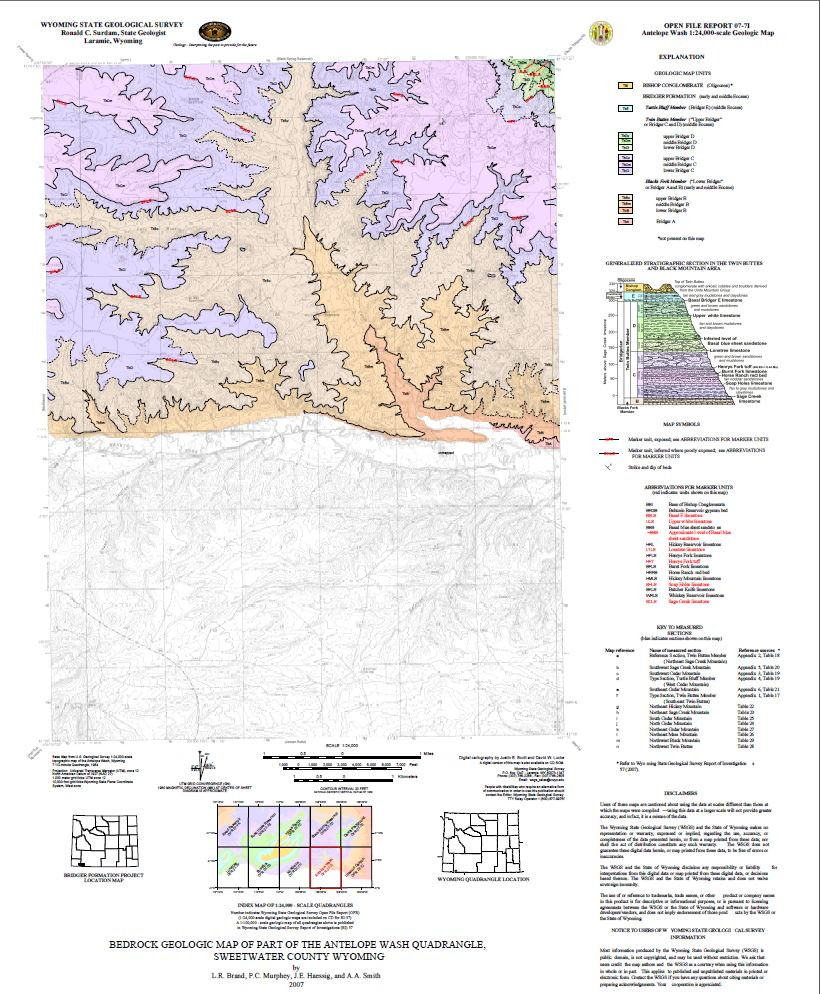 | Bibliographic Reference | Brand, L.R., Murphey, P.C., Haessig, J.E., and Smith, A.A., 2007, Bedrock geologic map of part of the Antelope Wash quadrangle, Sweetwater County, Wyoming: Wyoming State Geological Survey Open File Report 07-7I, scale 1:24,000. |