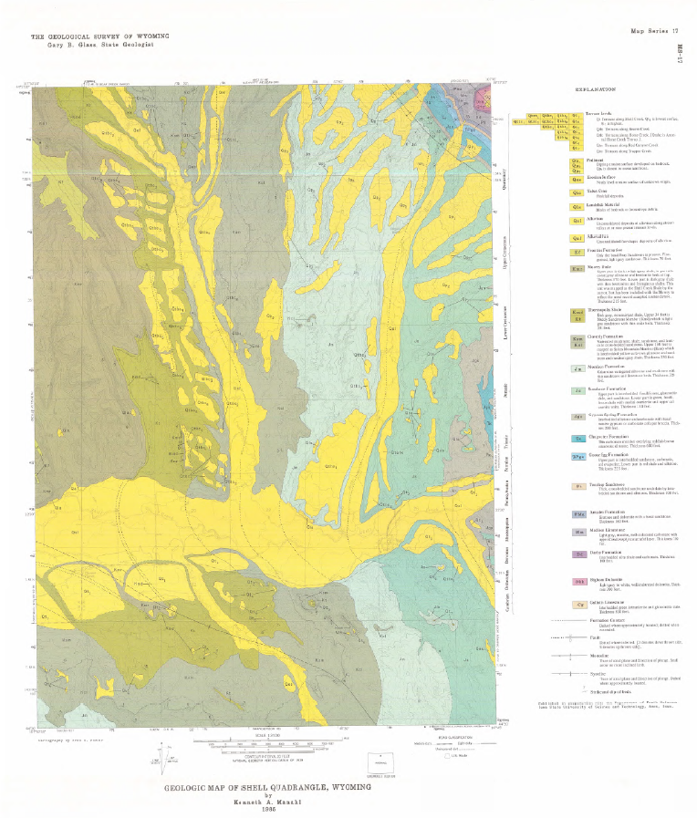 Manahl, K.A., 1985, Geologic map of Shell quadrangle, Wyoming: Geological Survey of Wyoming [Wyoming State Geological Survey] Map Series 17, scale 1:24,000.