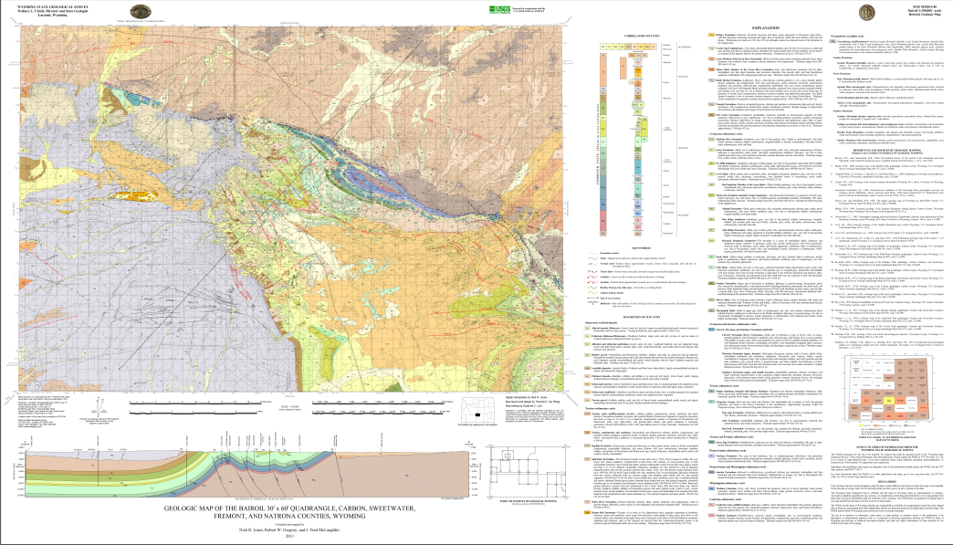 | Bibliographic Reference | Jones, N.R., Gregory, R.W., and McLaughlin, J.F., 2011, Geologic map of the Bairoil 30' x 60' quadrangle, Carbon, Fremont, Sweetwater, and Natrona counties, Wyoming: Wyoming State Geological Survey Map Series 86, scale 1:100,000. |