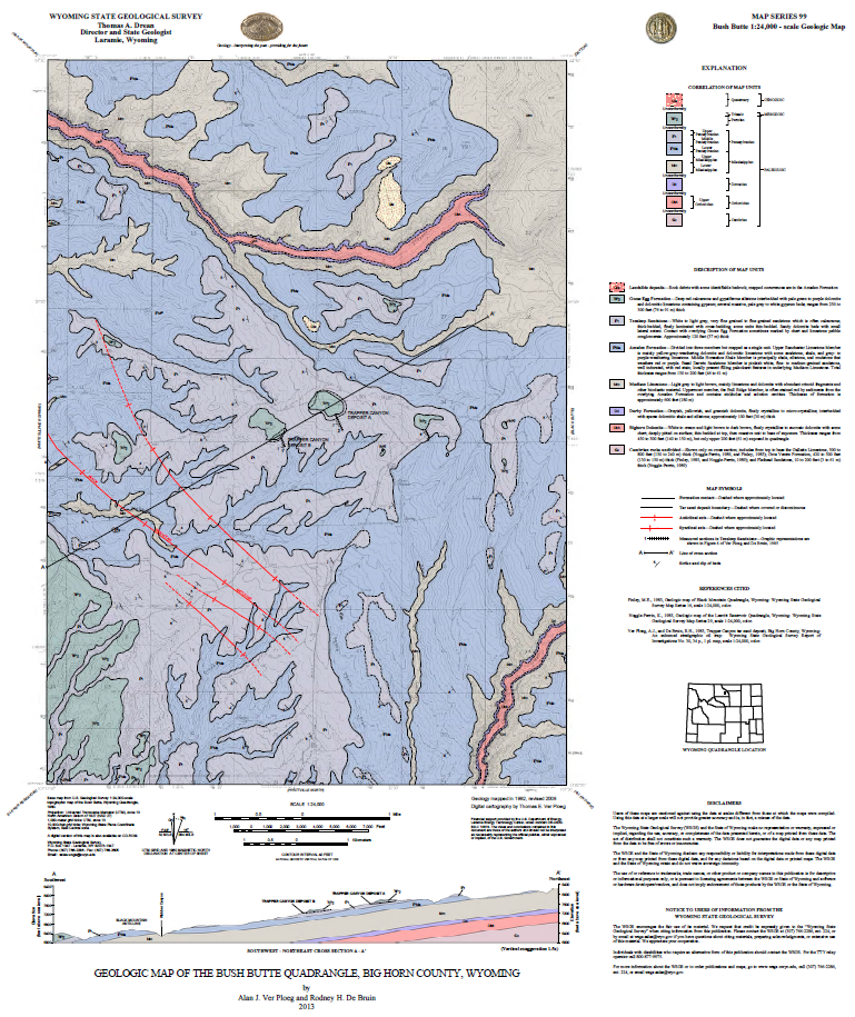 Ver Ploeg, A.J., and De Bruin, R.H., 2013, Geologic map of the Bush Butte quadrangle, Big Horn County, Wyoming: Wyoming State Geological Survey Map Series 99, scale 1:24,000.