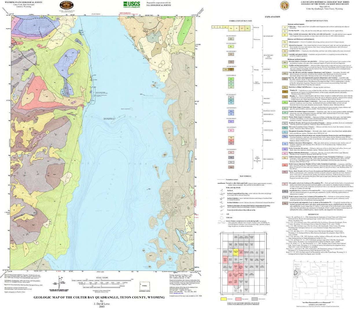 Love, J.D., 2003, Geologic map of the Colter Bay quadrangle, Teton County, Wyoming: Wyoming State Geological Survey Love Map Series 10, scale 1:24,000.