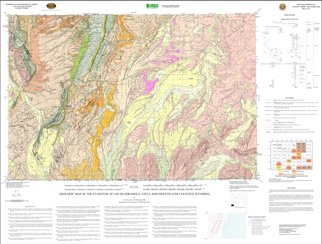Dover, J.H., and M'Gonigle, J.W., 2004, Geologic map of the Evanston 30' x 60' quadrangle, Uinta and Sweetwater counties, Wyoming: Wyoming State Geological Survey Open File Report 04-6, 2 sheets, scale 1:100,000.