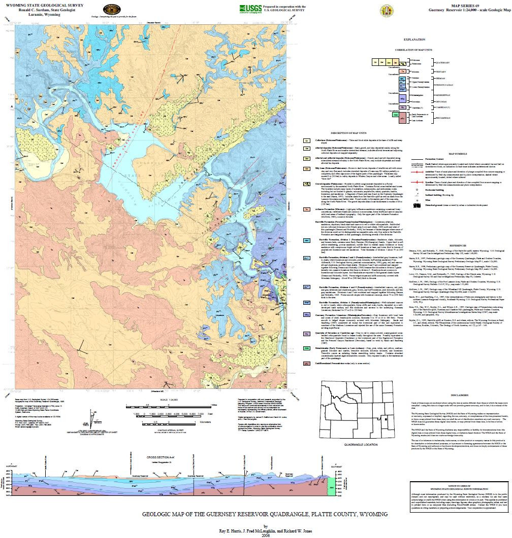 Harris, R.E., McLaughin, J.F., and Jones, R.W., 2006, Geologic map of the Guernsey Reservoir quadrangle, Platte County, Wyoming: Wyoming State Geological Survey Map Series 69, scale 1:24,000.