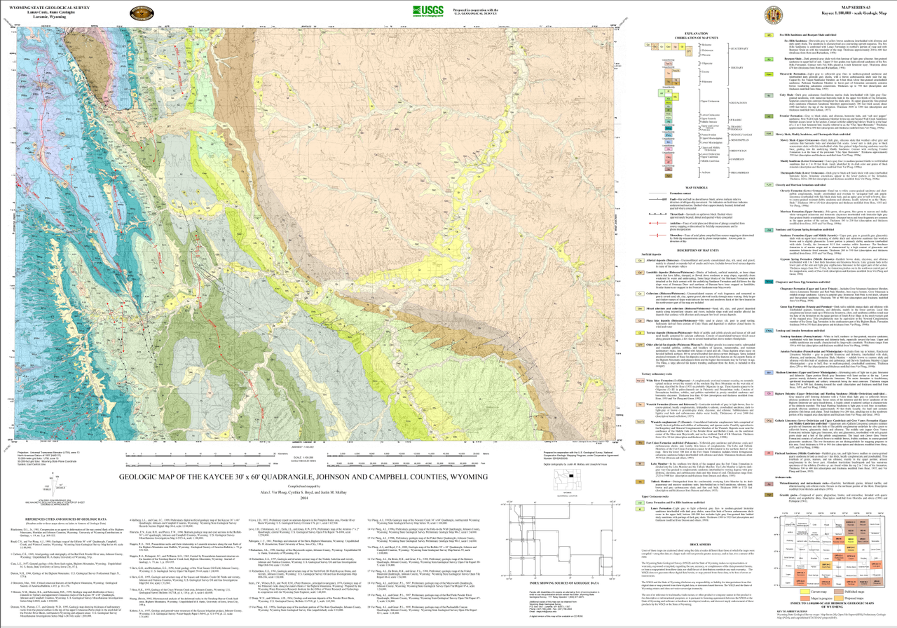 Ver Ploeg, A.J., Boyd, C.S., and Mulbay, J.M., 2004, Geologic map of the Kaycee 30' x 60' quadrangle, Johnson, and Campbell counties, Wyoming: Wyoming State Geological Survey Map Series 63, scale 1:100,000.