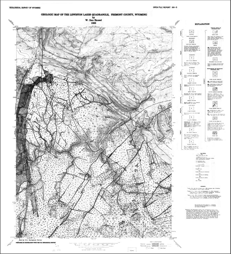 Hausel, W.D., 1988, Geologic map of the Lewiston Lakes quadrangle, Fremont County, Wyoming: Wyoming Geological Survey [Wyoming State Geological Survey] Open File Report 88-3, scale 1:24,000.