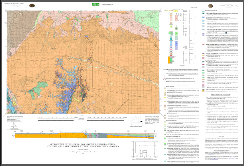 | Bibliographic Reference | McLaughlin, J.F., Stafford, J.E., and Harris, R.E., 2011, Geologic map of the Lusk 30’ x 60’ quadrangle, Niobrara, Goshen, Converse, and Platte counties, Wyoming, and Sioux County, Nebraska: Wyoming State Geological Survey Map Series 82, scale 1:100,000. |