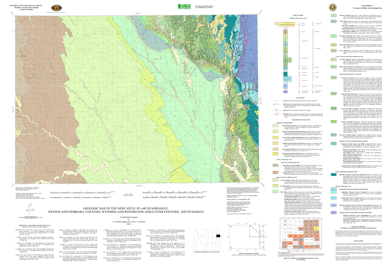 | Bibliographic Reference | McLaughlin, J.F., and Ver Ploeg, A.J., 2006, Geologic map of the Newcastle 30' x 60' quadrangle, Weston and Niobrara counties, Wyoming, and Pennington and Custer counties, South Dakota: Wyoming State Geological Survey Map Series 71, scale 1:100,000. |