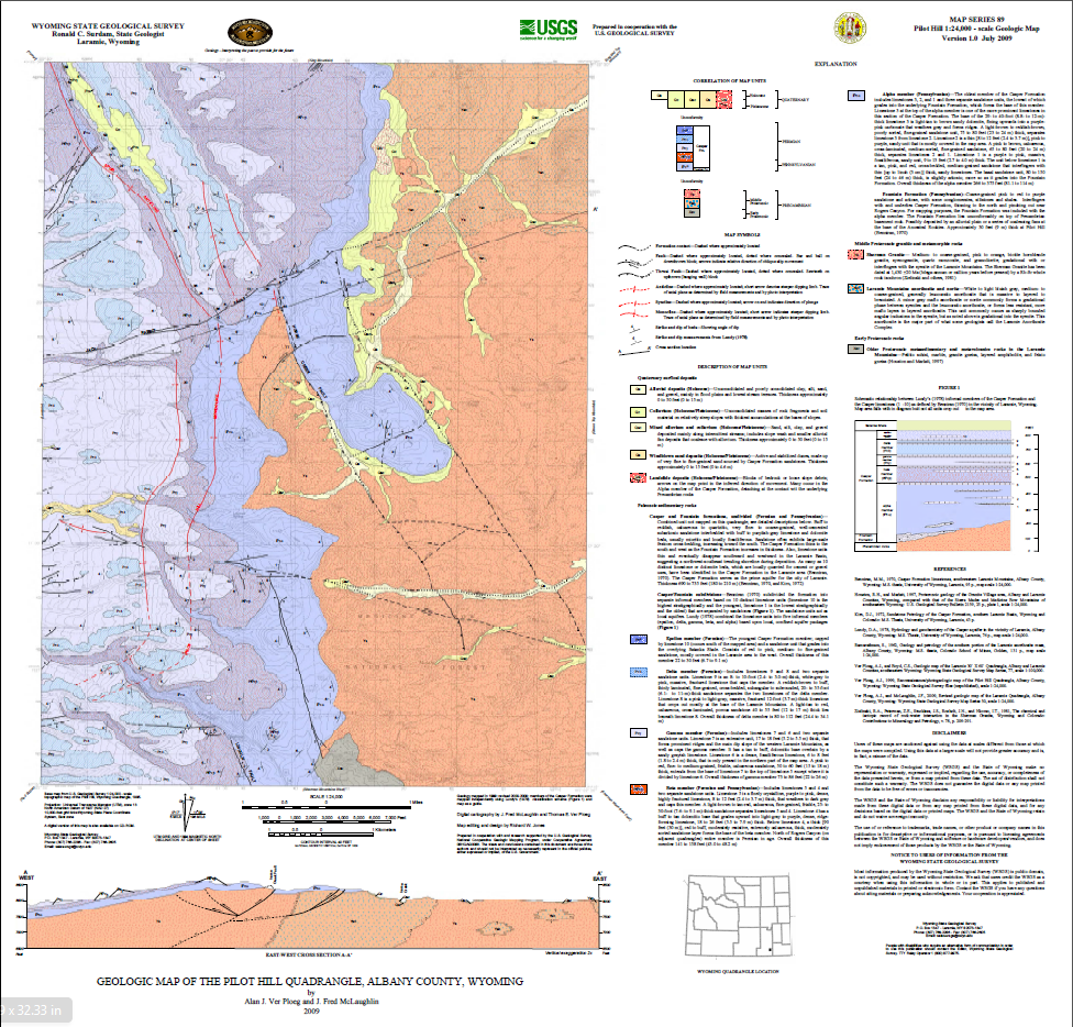 Ver Ploeg, A.J., and McLaughlin, J.F., 2009, Geologic map of the Pilot Hill quadrangle, Albany County, Wyoming: Wyoming State Geological Survey Map Series 89, scale 1:24,000.