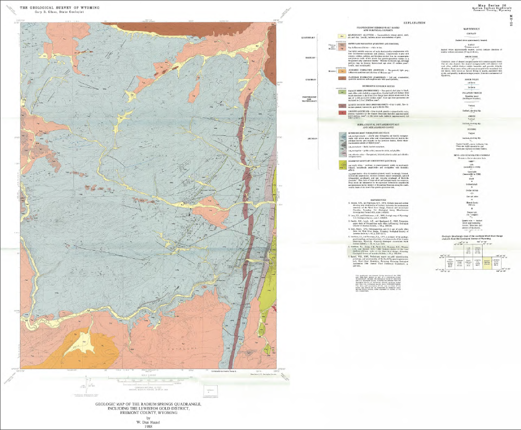 Hausel, W.D., 1988, Geologic map of the Radium Springs quadrangle, including the Lewiston gold district, Fremont County, Wyoming: Geological Survey of Wyoming [Wyoming State Geological Survey] Map Series 26, scale 1:24,000.