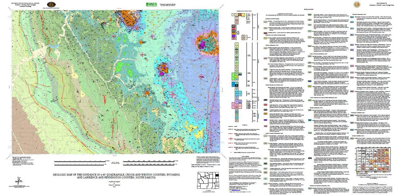 | Bibliographic Reference | Sutherland, W.M., 2007, Geologic map of the Sundance 30' x 60' quadrangle, Crook and Weston counties, Wyoming, and Lawrence and Pennington counties, South Dakota: Wyoming State Geological Survey Map Series 78, 26 p., scale 1:100,000. |