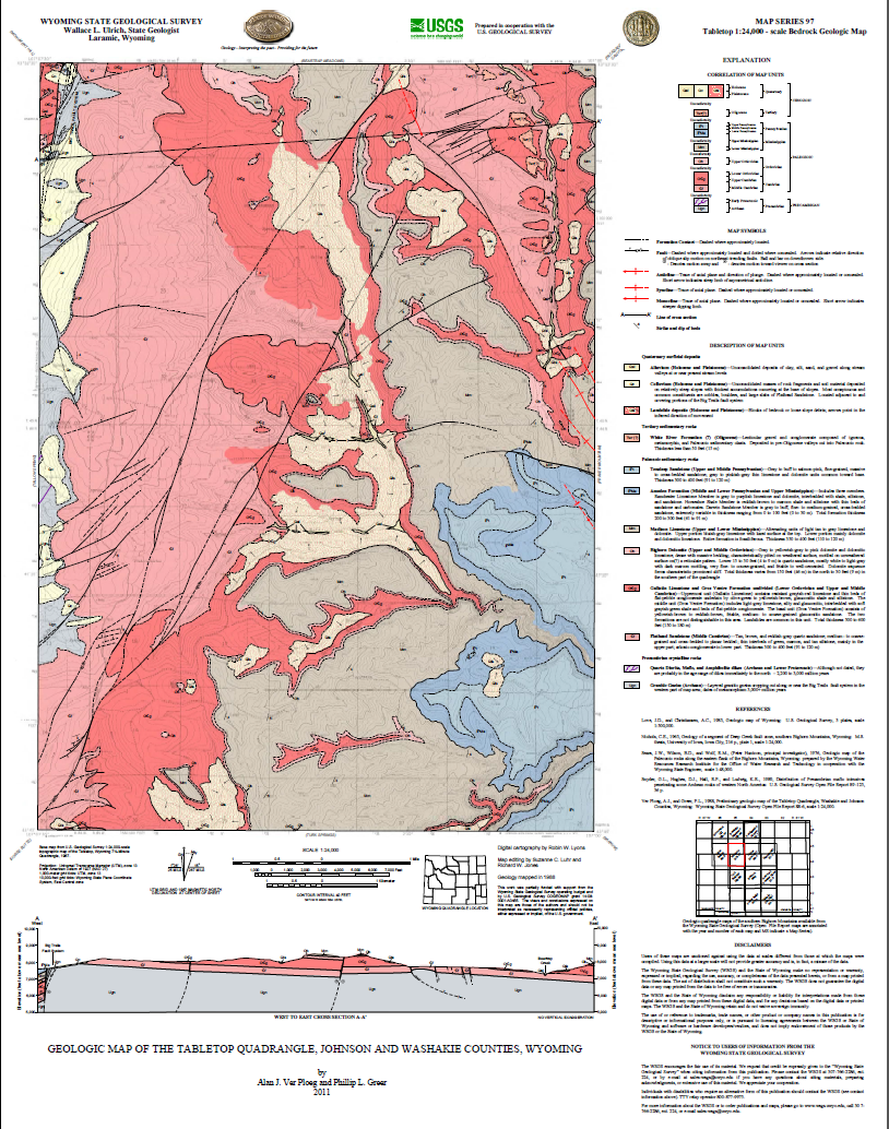Ver Ploeg, A.J., and Greer, P.L., 2011, Geologic map of the Tabletop quadrangle, Johnson and Washakie counties, Wyoming: Wyoming State Geological Survey Map Series 97, scale 1:24,000.