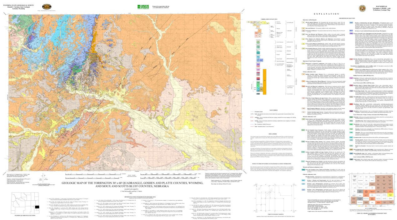 McLaughlin, J.F., and Harris, R.E., 2005, Geologic map of the Torrington 30' x 60' quadrangle, Goshen and Platte counties, Wyoming, and Sioux and Scotts Bluff counties, Nebraska: Wyoming State Geological Survey Map Series 66, scale 1:100,000.