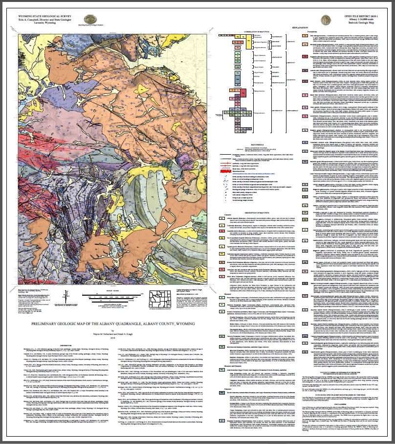 Sutherland, W.M., and Kragh, N.A., 2018, Preliminary geologic map of the Albany quadrangle, Albany County, Wyoming: Wyoming State Geological Survey Open File Report 2018-1, 45 p., 1 pl., scale 1:24,000.