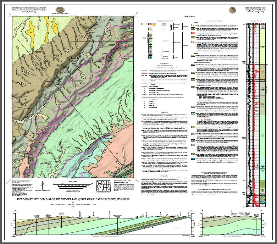 | Bibliographic Reference | Lichtner, D.T., Carnes, J.D., Wittke, S.J., and Carroll, C.J., 2017, Preliminary geologic map of the Bridger Pass quadrangle, Carbon County, Wyoming: Wyoming State Geological Survey, Open File Report 2017-6, 41 p., scale 1:24,000. |