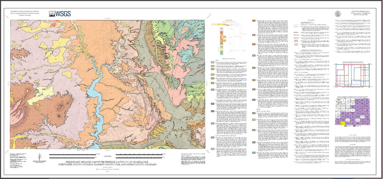 | Bibliographic Reference | Lichtner, D.T., Schwaderer, C.W., 2024, Preliminary geologic map of the Firehole Canyon 30' x 60' quadrangle, Sweetwater County, Wyoming, Daggett County, Utah, and Moffat County, Colorado. Wyoming State Geological Survey Open File Report 2024-1, 16 p., scale 1:100,000, https://doi.org/10.15786/wyoscholar/10032. |