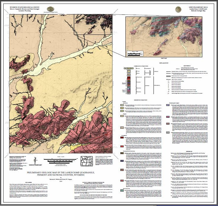 Webber, P.M., and Gregory, R.W., 2019, Preliminary geologic map of the Lankin Dome quadrangle, Fremont and Natrona counties, Wyoming: Wyoming State Geological Survey Open File Report 2019-4, scale 1:24,000.