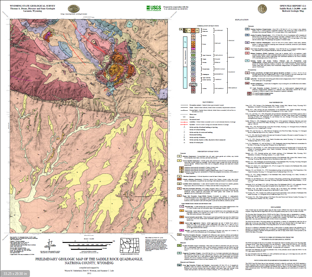 Sutherland, W.M., Worman, B.N., and Luhr, S.C., 2012, Preliminary geologic map of the Saddle Rock quadrangle, Natrona County, Wyoming: Wyoming State Geological Survey Open File Report 12-1, scale 1:24,000.
