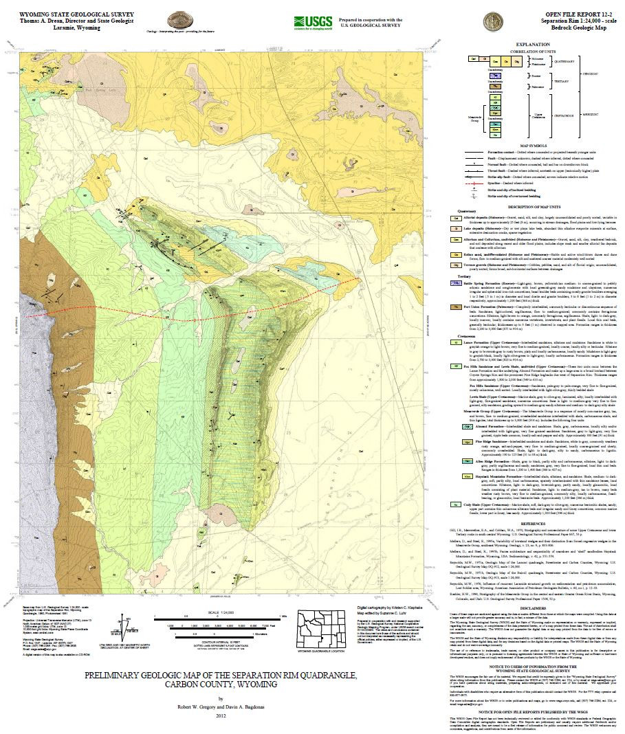Gregory, R.W., and Bagdonas, D.A., 2012, Preliminary geologic map of the Separation Rim quadrangle, Carbon county, Wyoming: Wyoming State Geological Survey Open File Report 12-2, scale 1:24,000.