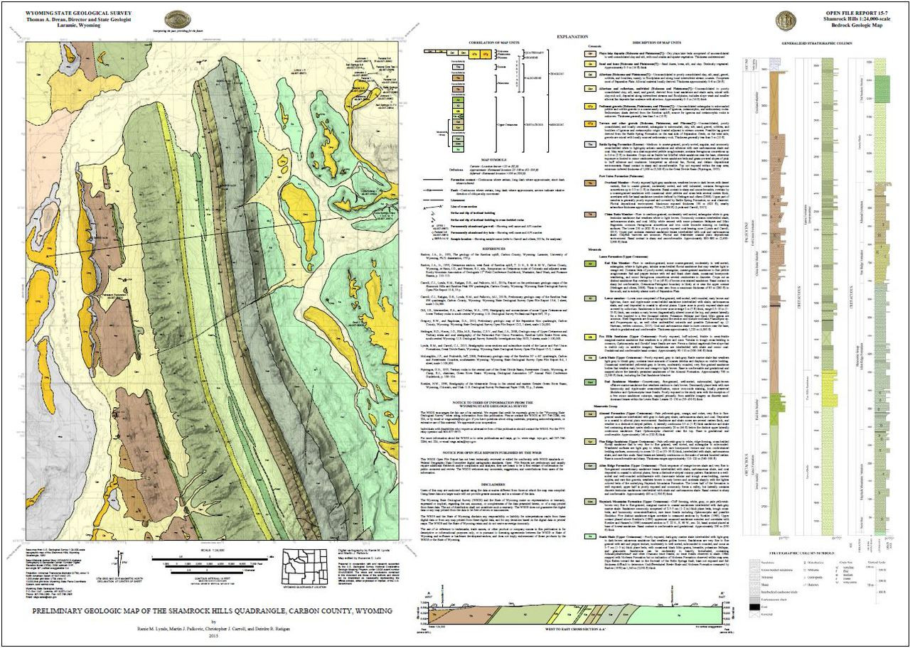 Lynds, R.M., Palkovic, M.J., Carroll, and C.J., Ratigan, D.R., 2015, Preliminary geologic map of the Shamrock Hills quadrangle, Carbon County, Wyoming: Wyoming State Geological Survey Open File Report 15-7, scale 1:24,000.