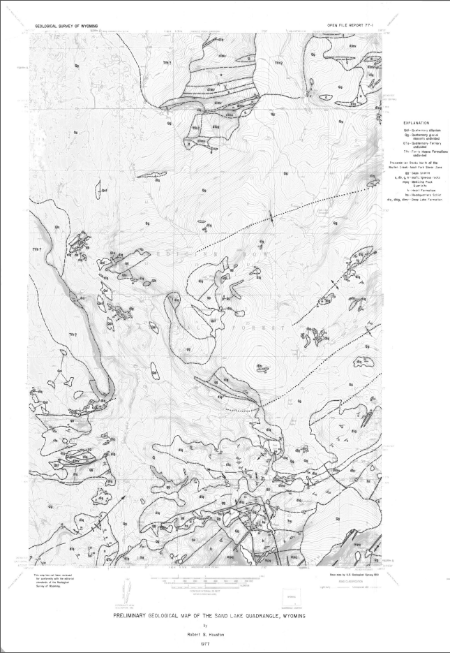 Houston, R.S., 1977, Preliminary geologic map of the Sand Lake quadrangle, Wyoming: Wyoming Geological Survey [Wyoming State Geological Survey] Open File Report 77-1, scale 1:24,000.