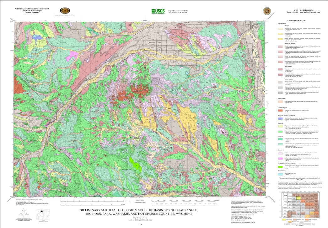 | Bibliographic Reference | Hallberg, L.L., and Case, J.C., 2003, Preliminary surficial geologic map of the Basin 30' x 60' quadrangle, Big Horn, Park, Washakie, and Hot Springs counties, Wyoming: Wyoming State Geological Survey Open File Report 03-6, scale 1:100,000. |