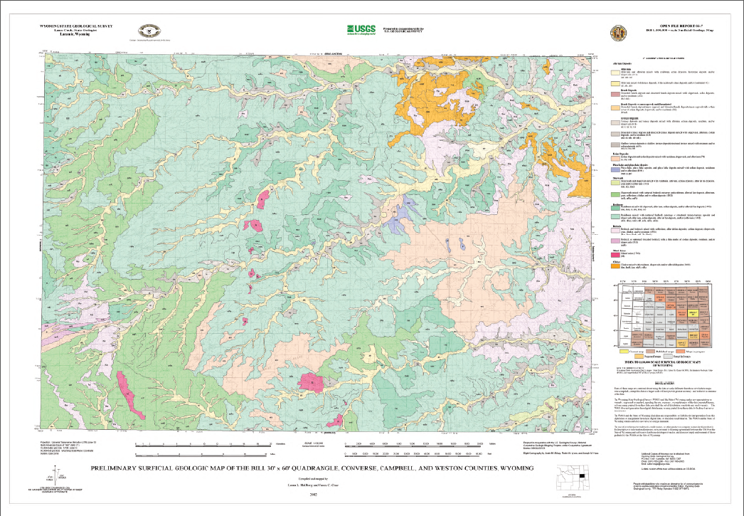 | Bibliographic Reference | Hallberg, L.L., and Case, J.C., 2003, Preliminary surficial geologic map of the Bill 30' x 60' quadrangle, Converse, Campbell, and Weston counties, Wyoming: Wyoming State Geological Survey Open File Report 03-7, scale 1:100,000. |