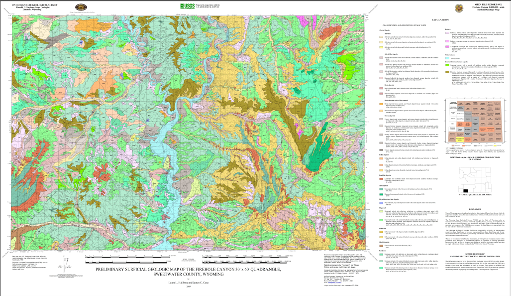 Hallberg, L.L., and Case, J.C., 2009, Preliminary surficial geologic map of the Firehole Canyon 30' x 60' quadrangle, Sweetwater County, Wyoming: Wyoming State Geological Survey Open File Report 09-2, scale 1:100,000.