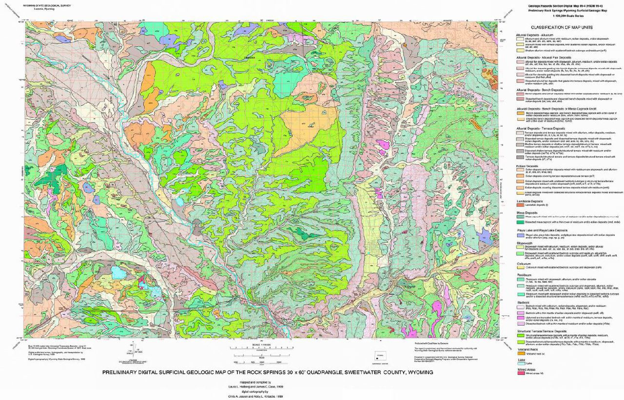 | Bibliographic Reference | Hallberg, L.L., and Case, J.C., 1999, Preliminary digital surficial geologic map of the Rock Springs 30' x 60' quadrangle, Sweetwater County, Wyoming: Wyoming State Geological Survey Hazards Section Digital Map 99-4, scale 1:100,000. |