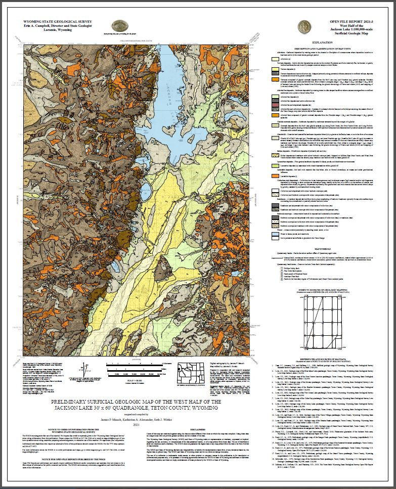 | Bibliographic Reference | Mauch, J.P., Alexander, K.A., and Wittke, S.J., 2021, Preliminary surficial geologic map of the west half of the Jackson Lake 30' x 60' quadrangle, Teton County, Wyoming: Wyoming State Geological Survey Open File Report 2021-3, 22 p., scale 1:100,000. |
