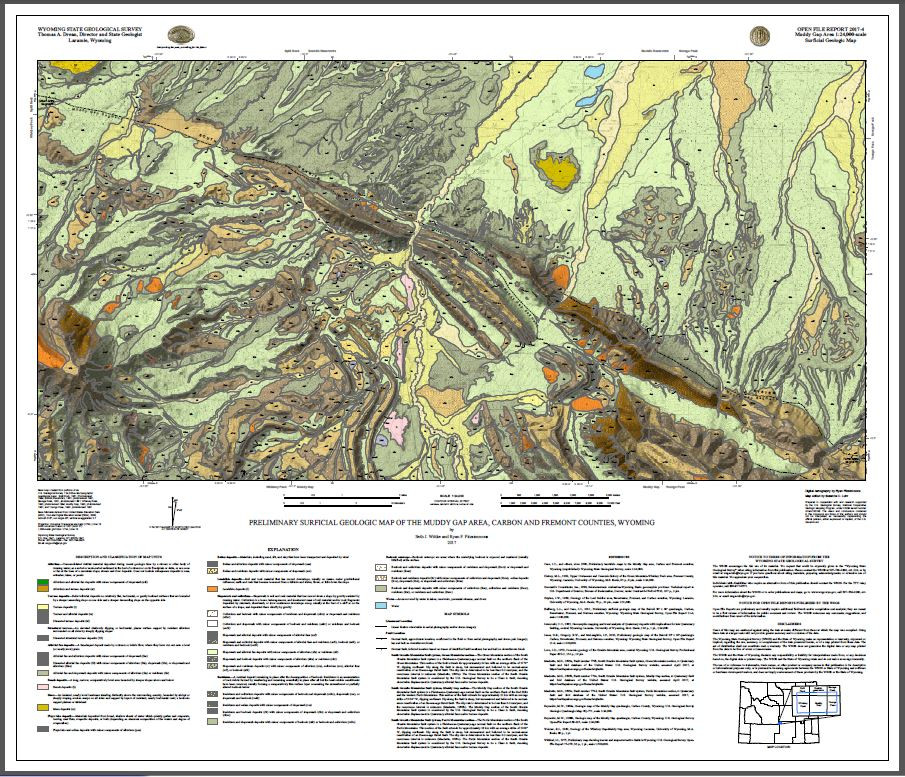 Wittke, S.J., and Fitzsimmons, R.P., 2017, Preliminary surficial geologic map of the Muddy Gap area, Carbon and Fremont counties, Wyoming: Wyoming State Geological Survey, Open File Report 2017-4, 5 p., scale 1:24,000.