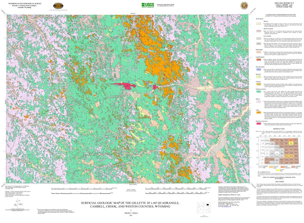 Reheis, M.C., 2007, Surficial geologic map of the Gillette 30' x 60' quadrangle, Campbell, Crook, and Weston counties, Wyoming: Wyoming State Geological Survey Open File Report 07-2, scale 1:100,000.