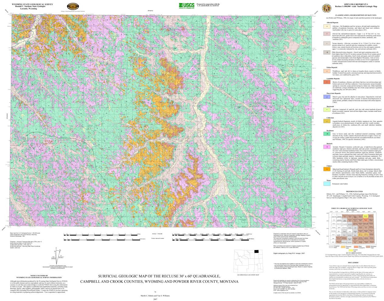 | Bibliographic Reference | Reheis, M.C., and Williams, V.S., 2007, Surficial geologic map of the Recluse 30' x 60' quadrangle, Campbell and Crook counties, Wyoming and Powder River County, Montana: Wyoming State Geological Survey Open File Report 07-1, scale 1:100,000. |
